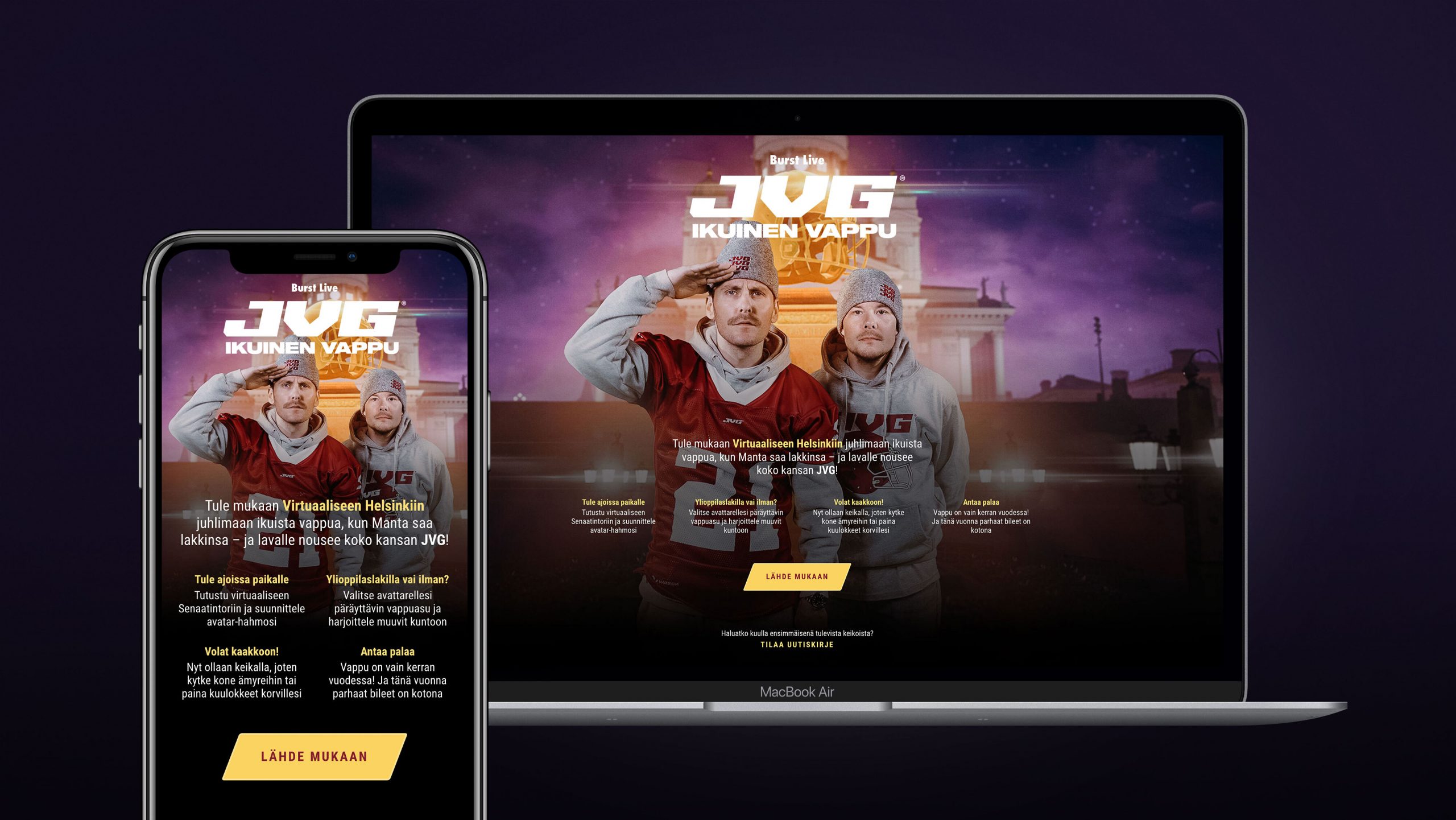 BurstWe had the honor of being involved in building the digital event platform for JVG's May Day concert, the Burst.fi website.