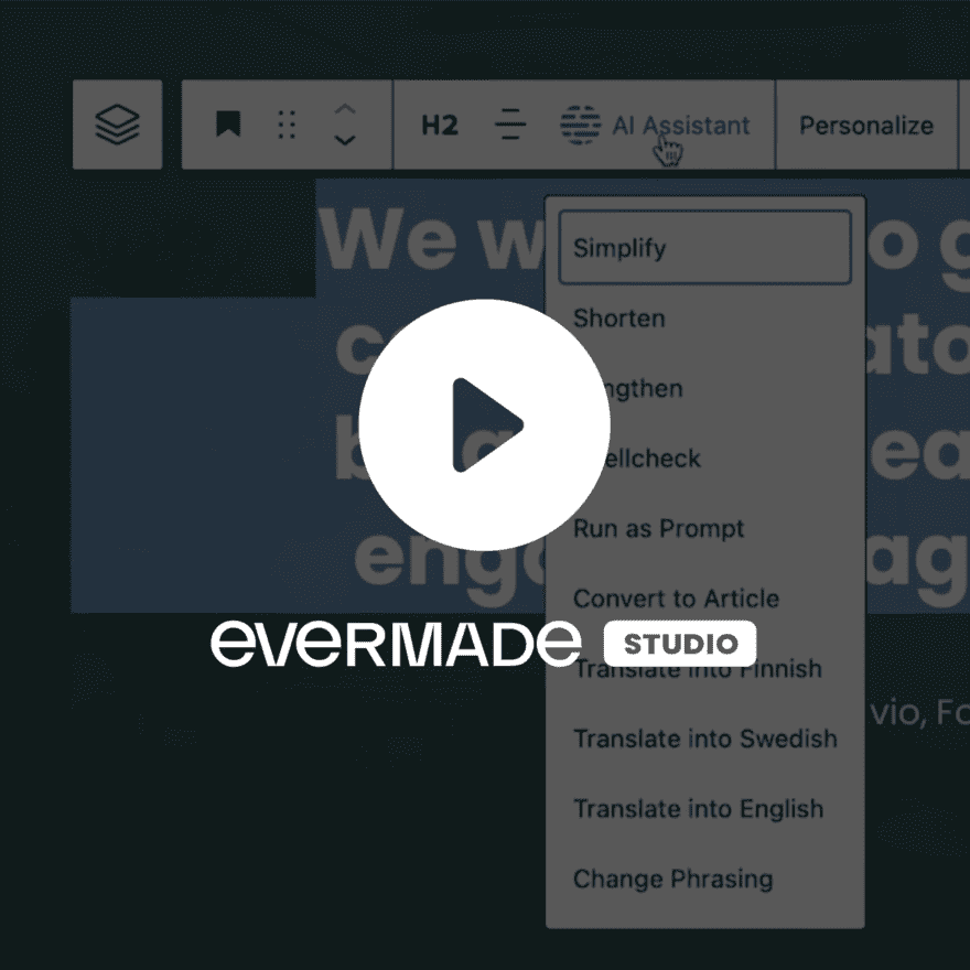Evermade Studio: Tekoälyapuri sisällöntuotantoonTekoäly nopeuttaa sisällöntuotantoon liittyviä töitä käännöksistä ideointiin. Toimme tekoälyn suoraan WordPressin editoriin.