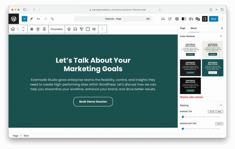 Oletuksena WordPressissä valitaan erikseen teksti- ja taustavärejä joita pitää usein valita useammalta tasolta erikseen. Tämä on sekä työlästä että virhealtista, sillä sisällöntuottaja saattaa valita sellaisen tekstin ja taustan yhdistelmän, joka ei ole brändin mukainen. Yhdistimme värien hallinnan yhteen väriteemasäätimeen, jolla yhdellä kertaa valitaan osion tekstin, taustan, painikkeiden ja ikonien väritys.