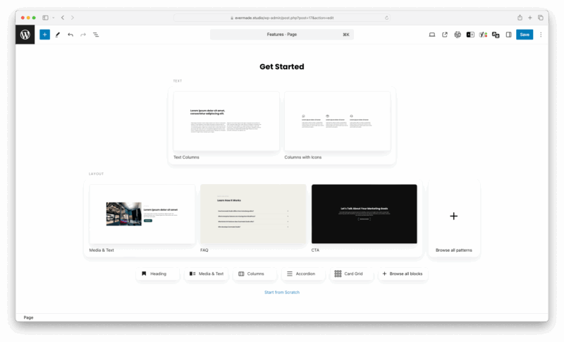Tavallisesti WordPressin Gutenberg-editorissa voi suoraan syöttää mitä tahansa lohkoja väliotsikoista koko näytön levyisiin kuviin ja sisältönostoihin. Tämä tuo sekavuutta editoriin, koska yhtä selkeää polkua luoda sisältöä ei ole. Jos myöhemmin johonkin osioon haluaa esimerkiksi taustavärin, täytyy koko osion rakennetta muuttaa.