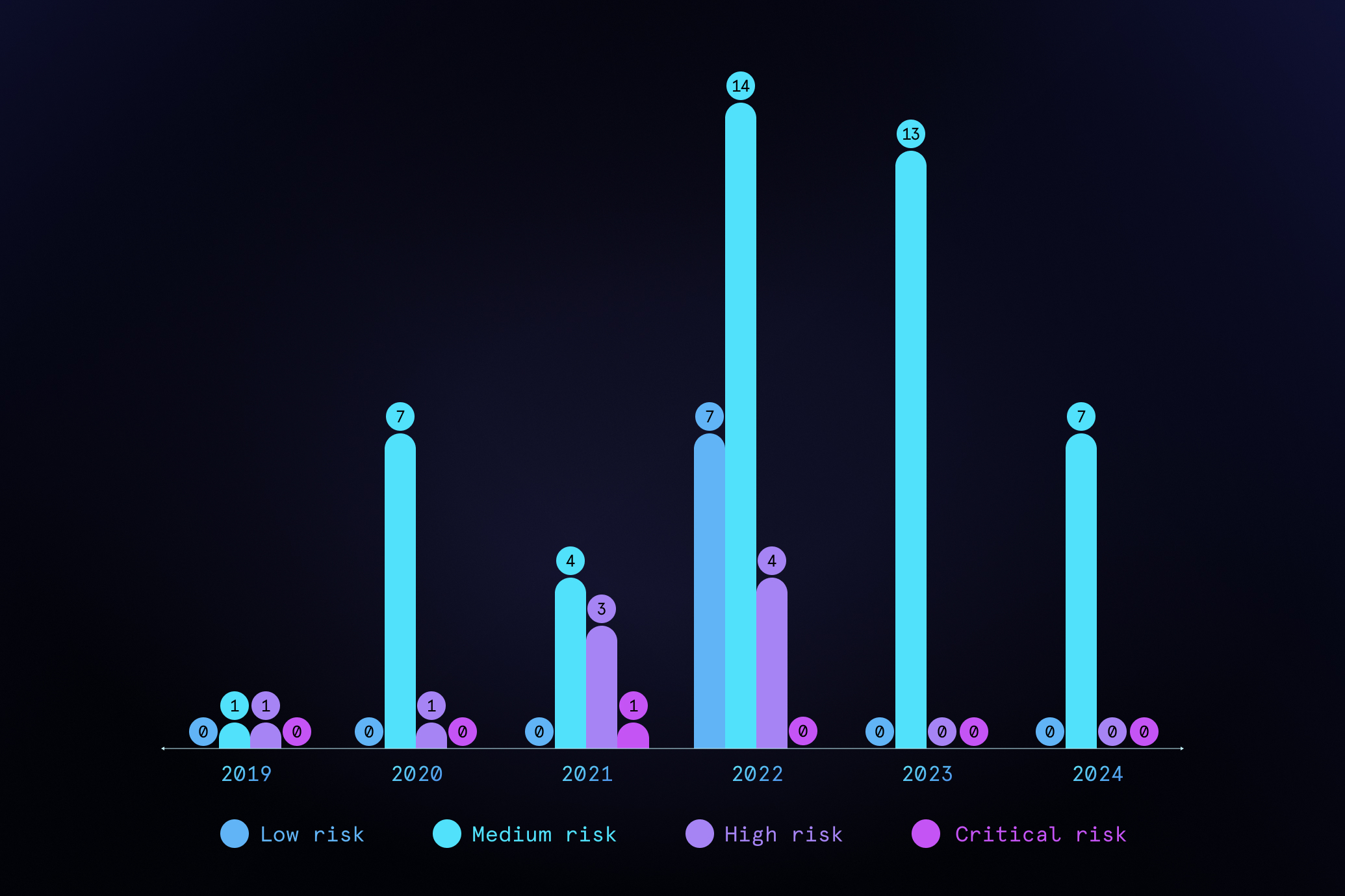 WordPressin ytimestä vuosina 2023 ja 2024 löydetyt haavoittuvuudet on kaikki luokiteltu kahdelle alimmalle tasolle. Edellisen kerran WordPressin ytimestä on löydetty korkealle vakavuustasolle luokiteltu haavoittuvuus vuonna 2022 ja kriittiselle tasolle luokiteltu haavoittuvuus vuonna 2021. Näille korkeille tasoille luokiteltuja haavoittuvuuksia voi kuitenkin pitää melkeinpä yksittäistapauksina, sillä niitä löytyy hyvin harvoin.