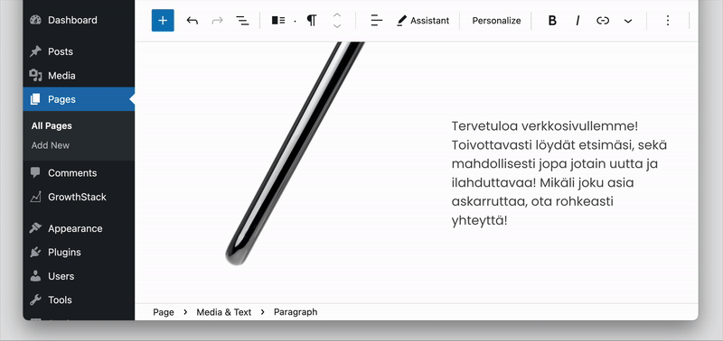 Evermade Studio -työkalullamme voit muokata verkkosivun sisältöä tekoälyn avulla, kuten kääntämällä sen helposti yhdellä napin painalluksella eri kielelle. Sisällöntuottajan ei tarvitse siirtyä verkkosivun editorista muualle, vaan muutos tapahtuu suoraan editorin sisällä. Ajatus ei katkea, kun muutos tapahtuu välittömästi.