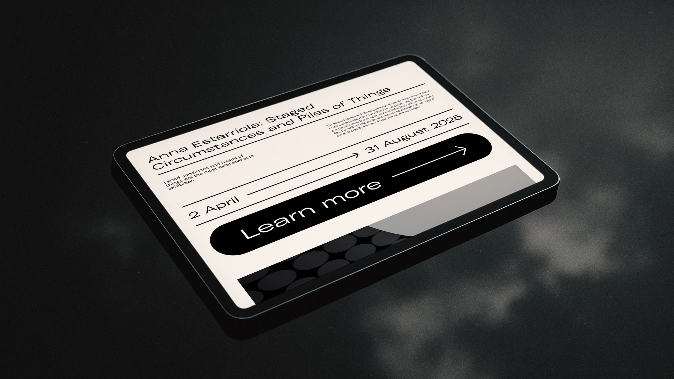 Our goal was to create a new website for Amos Rex that reflects the museum’s unique atmosphere and artistic identity. Like a visit to the museum, visiting the website was intended to be an aesthetic experience, creating a comparable, unique visual and emotional world as the physical space. The site needed to serve as an inspiring digital business card for the museum.